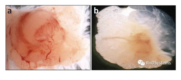 在SCID小鼠乳房內(nèi)脂肪墊中接種106MDA-MB-468后9天的腫瘤生長對比。(a)為混合了低生長因子無酚紅的基質(zhì)膠的實驗組,(b)為不加基質(zhì)膠的對照組?;|(zhì)膠的存在不但加快了腫瘤生長,也促進了血管形成。