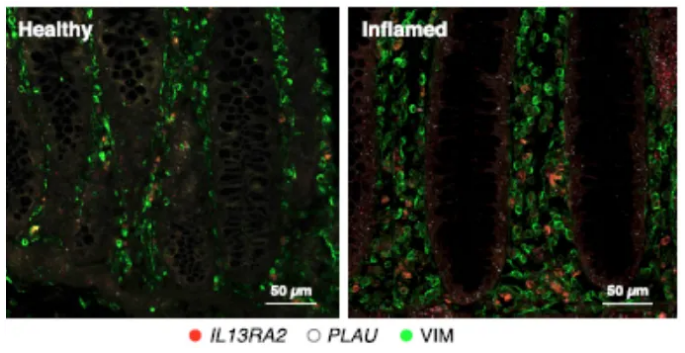 盡管大多數(shù)成纖維細胞亞群同時存在于健康個體和UC患者中,但一類稱之為炎癥相關成纖維細胞(IAFs)的亞群在一些病人的炎癥組織中表達擴大了189倍。IAFs富含許多與結腸炎、纖維化和癌癥相關的基因,包括IL11、IL24和IL13RA2。研究人員就利用RNAscope原位雜交技術檢測了健康組織與炎癥組織中的炎癥相關成纖維細胞的特征基因表達,證實了表達IL13RA2的炎癥相關成纖維細胞在炎癥組織中的表達遠高于正常組織(見下圖,紅色為RNAscope檢測到的IL13RA2的RNA信號)。