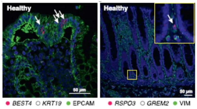 2019年來自麻省理工學院和哈佛大學的研究學者在《Cell》雜志上發(fā)表的一篇研究論文揭示了潰瘍性結腸炎的耐藥機制[1]。在這項研究中,研究人員利用scRNA-seq從18例潰瘍性結腸炎(UC)患者和12例健康人的結腸粘膜中生成了366,650個細胞的圖譜,以此來了解細胞類型特異性和作用途徑,揭示了51個上皮細胞、基質細胞和免疫細胞亞群。在UC患者中,腫瘤壞死因子(TNF)蛋白水平較高,抗TNF藥物可減輕炎癥并治愈許多患者的組織。然而,大約30%的患者對治療沒有響應,而那些有響應的患者隨著時間的推移變得具有耐藥性。研究人員此前已經(jīng)確定了耐藥性相關的基因,但尚不清楚結腸中哪些特定的細胞類型表達了這些基因。在此次研究中,單細胞測序數(shù)據(jù)分析表明BEST4 +腸上皮細胞,RSPO3+成纖維細胞,IL13RA2 + IL11 +炎性成纖維細胞等細胞亞群與抗腫瘤壞死因子(TNF)治療的抗性有關。研究人員進一步利用RNAscope原位雜交結合免疫熒光驗證并從空間定位上展現(xiàn)了單細胞測序的主要發(fā)現(xiàn)。下圖為使用RNAscope檢測到的健康人BEST4 +腸上皮細胞(左圖,紅色表示RNAscope檢測到的BEST4的RNA信號)與RSPO3+成纖維細胞(右圖,紅色表示RNAscope檢測到的RSPO3的RNA信號)在腸道中的定位情況。