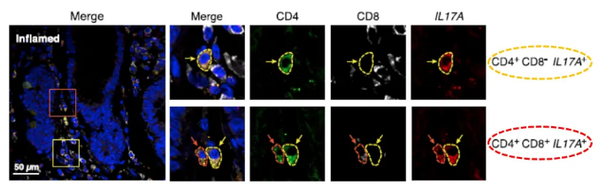 除了炎癥相關成纖維細胞外,單細胞測序分析結果也表明在UC患者樣本中,同時表達CD8和IL-17的T細胞所占比例更高。在進一步的RNAscope原位雜交驗證中發(fā)現(xiàn)CD4+與CD4- T細胞都共表達CD8與IL17A(見下圖,紅色為RNAscope檢測到的IL17A的RNA信號)。其中CD4+ CD8+IL17A+ T細胞是一類新發(fā)現(xiàn)的細胞亞群,在炎癥組織中,CD4+ CD8+IL17A+ T細胞的數(shù)量明顯增加。