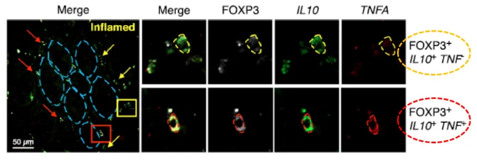 腫瘤壞死因子(TNF)的表達在UC患者中發(fā)生改變,Treg細胞從健康組織向炎癥組織擴展,是炎癥過程中TNF的主要來源。在炎癥組織中,TNF在Treg細胞中誘導表達。研究人員利用RNAscope原位雜交檢測了IL10,TNFA以及Treg細胞標志基因FOXP3的表達,驗證了在炎癥組織中Treg細胞中TNF的表達顯著上升(見下圖,白色為RNAscope檢測到的FOXP3的RNA信號,綠色為RNAscope檢測到的IL10的RNA信號,紅色為RNAscope檢測到的TNFA的RNA信號)。