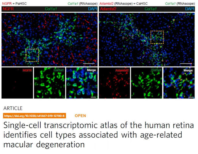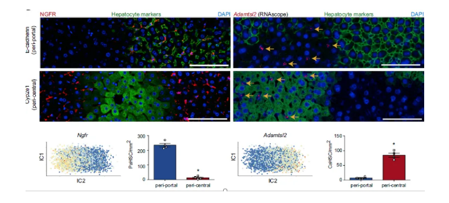 急性CCL4誘導的肝損傷的特征是HSCs顯著增值以及被激活為肝小葉中心區(qū)域產生膠原的肌成纖維細胞。為了進一步研究PaHSCs和CaHSCs分化為致病性膠原產生細胞的動態(tài),研究人員利用單細胞測序分析了急性CCL4誘導的肝損傷小鼠模型的HSCs。結果表明PaHSCs和CaHSCs兩個細胞亞群均表達細胞增殖標志物ki67,而只有CaHSCs中纖維化相關的基因表達顯著升高。利用RNAscope原位雜交結合免疫熒光證實了CaHSCs是在肝小葉中心性損傷導致的纖維化過程中產生病原膠質的主要細胞(見下圖,左圖紅色為RNAscope檢測到的NGFR的RNA信號,右圖紅色為RNAscope檢測到的Adamtsl2的RNA信號)。