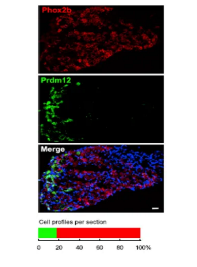 迷走神經(jīng)感覺神經(jīng)元是控制器官功能所必需的,但目前對所涉及的神經(jīng)元類型的復雜性仍缺乏了解。2019年來自瑞典卡羅林斯卡研究所的研究人員通過scRNA-seq對頸靜脈和結節(jié)性迷走神經(jīng)節(jié)的神經(jīng)元類型進行了全面的鑒定和分類,鑒定出6種頸靜脈神經(jīng)元和18種節(jié)狀神經(jīng)元[4]。小鼠迷走神經(jīng)神經(jīng)節(jié)復合體包括神經(jīng)嵴衍生的頸靜脈神經(jīng)節(jié)和基板來源的節(jié)狀神經(jīng)節(jié),轉錄因子Phox2b可作為節(jié)狀神經(jīng)元的標志物,另一種轉錄因子Prdm12可作為頸靜脈神經(jīng)元的標志物。在此研究中,單細胞測序鑒定的24個迷走神經(jīng)節(jié)神經(jīng)元細胞群中有18個表達Phox2b,其余6個表達Prdm12。研究人員使用RNAscope技術進一步地量化分析了分別表達Phox2b與Prdm12的神經(jīng)元的相對比例(見下圖,紅色為RNAscope檢測到的Phox2b的RNA信號,綠色為RNAscope檢測到的Prdm12的RNA信號),結果表明在469個神經(jīng)元中,386個表達Phox2b,83個表達Prdm12。與單細胞測序結果一致,表明迷走神經(jīng)神經(jīng)節(jié)復合體由約85%的節(jié)狀神經(jīng)元與約15%的頸靜脈神經(jīng)元組成。