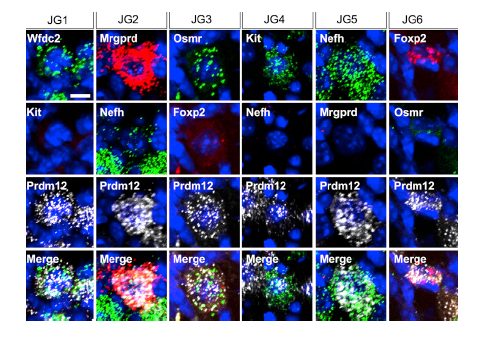 scRNA-seq鑒定的6種頸靜脈神經(jīng)元分別命名為JG1-JG6。6種頸靜脈神經(jīng)元分別有相應的特異性表達基因,JG1為Wfdc2,JG2為Mrgprd,JG3為Osmr,JG4為Kit,JG5為Nefh,JG6為Foxp2。為了證實這6種頸靜脈神經(jīng)元在體內的分布,研究人員用RNAscope多重熒光原位雜交進行了驗證,針對不同的神經(jīng)元亞群,分別設計了兩種探針,一種是每個神經(jīng)元亞群對應的特異性表達基因,一種是頸靜脈神經(jīng)元標志基因Prdm12,兩種探針聯(lián)合使用,原位鑒定6種不同的頸靜脈神經(jīng)元(見下圖,RNAscope檢測到的Wfdc2,Osmr,Kit,Nefh的RNA信號為綠色,RNAscope檢測到的Mrgprd,F(xiàn)oxp2的RNA信號為紅色,白色為RNAscope檢測到的Prdm12的RNA信號)。