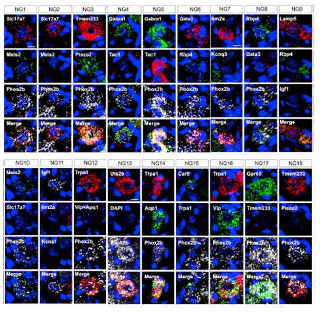 scRNA-seq鑒定的18種節(jié)狀神經(jīng)元分別命名為NG1-NG18,所有節(jié)狀神經(jīng)元類型都有獨特的基因表達模式。研究人員用RNAscope原位雜交的方法檢測18種節(jié)狀神經(jīng)元的特征基因以及所有節(jié)狀神經(jīng)元的共同標志基因Phox2b的表達,從空間定位上鑒定了18種不同的節(jié)狀神經(jīng)元類型(見下圖,白色為RNAscope檢測到的Phox2b的RNA信號,綠色和紅色分別為RNAscope檢測到的18種節(jié)狀神經(jīng)元的特征基因的RNA信號)。從而對測序結果進行了細胞和原位空間分布的驗證。