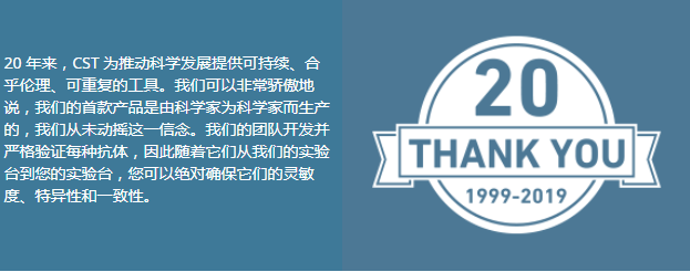 CST是一家由科學家創(chuàng)立的私營家族公司,致力于提供全球最高品質的創(chuàng)新研究和診斷產品,加速生物學認知以及實現個體化醫(yī)療。其高質量的產品和專業(yè)的研發(fā)精神已被全球客戶推崇為“細胞信號研究的金標準”和‘最佳抗體。CST 的可持續(xù)發(fā)展計劃在生物制藥行業(yè)受到普遍認可。