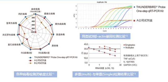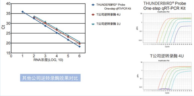 以檢測Flu病毒為例,模板拷貝數(shù)從101~106數(shù)量級,THUNDERBIRD?Probe One-step qRT-PCR Kit按標準體系進行,T公司的逆轉(zhuǎn)錄酶從1U增加到 4U,定量效果依然到不到本試劑盒效果。