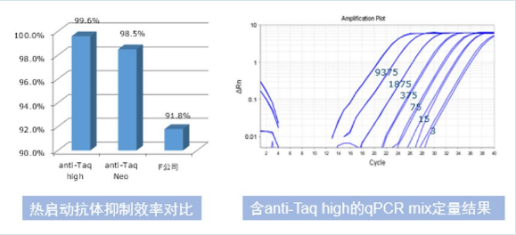 anti-Taq high是針對Taq DNA聚合酶的單克隆中和抗體,使用抗體熱啟動法可以有效抑制非特異性擴增,增強PCR的特異性和靈敏度。在進入PCR循環(huán)前的預變性階段,Taq酶的活性即被完全激活,使用起來方便快速。此外,可提供用于凍干的無甘油版本。