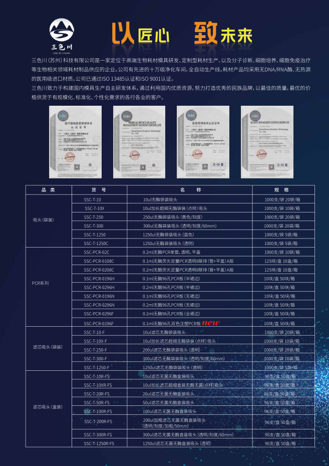 三色川(蘇州)科技有限公司是一家定位于高端生物耗材模具研發(fā)、定制型耗材生產(chǎn)、以及分子診斷、細(xì)胞培養(yǎng)、細(xì)胞免疫治療等生物相關(guān)領(lǐng)域耗材制品供應(yīng)的企業(yè)。公司有先進(jìn)的十萬(wàn)級(jí)凈化車(chē)間,全自動(dòng)生產(chǎn)線(xiàn)。耗材產(chǎn)品均采用無(wú)DNA/RNA酶、無(wú)熱源的醫(yī)用級(jí)進(jìn)口材質(zhì)。公司已通過(guò)ISO 13485認(rèn)證和ISO 9001認(rèn)證。